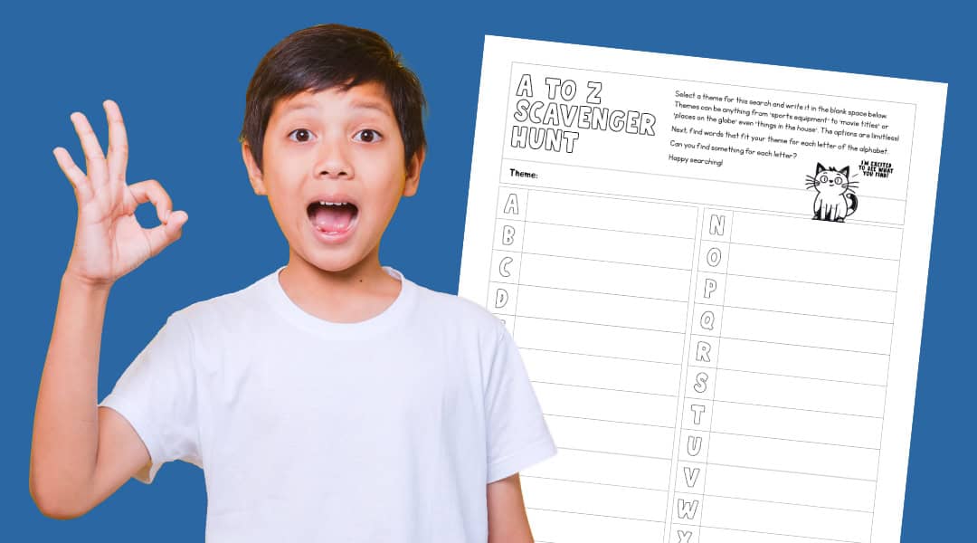 Our A to Z Scavenger Hunt sparks creativity and sharpens observation skills by challenging kids to find words related to a chosen topic – one for each letter of the alphabet.